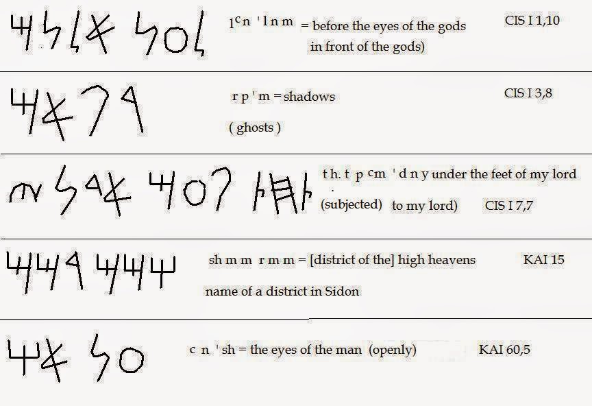 The Phoenicians have used mainly family inscriptions with ordinations to the gods. But sometimes they also use very evocative (language), that sometimes is even poetic. When displaying the Phoenician letters I followed largely the standardized system of: Dr.Alb.van den Branden (Université Saint-Esprit Kaslik – Liban, 1969). In parentheses are the words put that we would normally use.